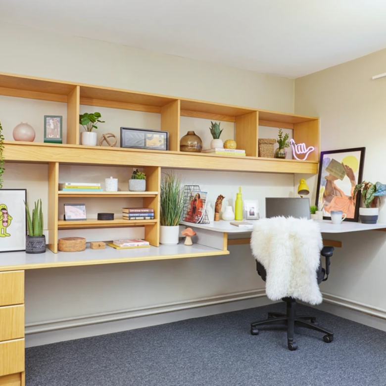 Yes — each room comes with bed, wardrobe/storage, study desk and chair, and bathroom; flats share fitted kitchens.